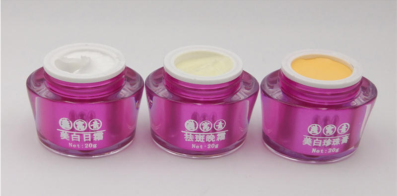 六件套包括:日霜、晚霜、珍珠膏、玫瑰花露-乳液、洗面奶
